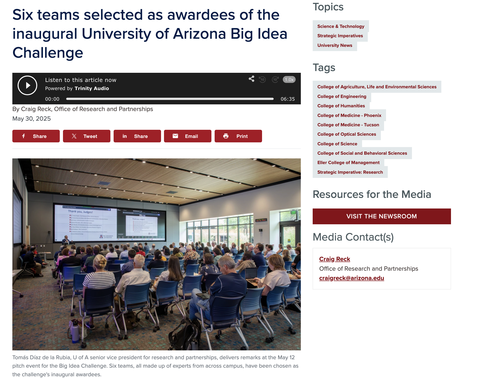 Six teams selected as awardees of the inaugural University of Arizona Big Idea Challenge SpringUA News Six teams selected as awardees of the inaugural University of Arizona Big Idea Challenge. BIO5 members Vignesh Subbian, Nirav Merchant, Cristian Roman Palacios, and Solange Duhamel are among the 2025 Big Idea Challenge awardees....read more