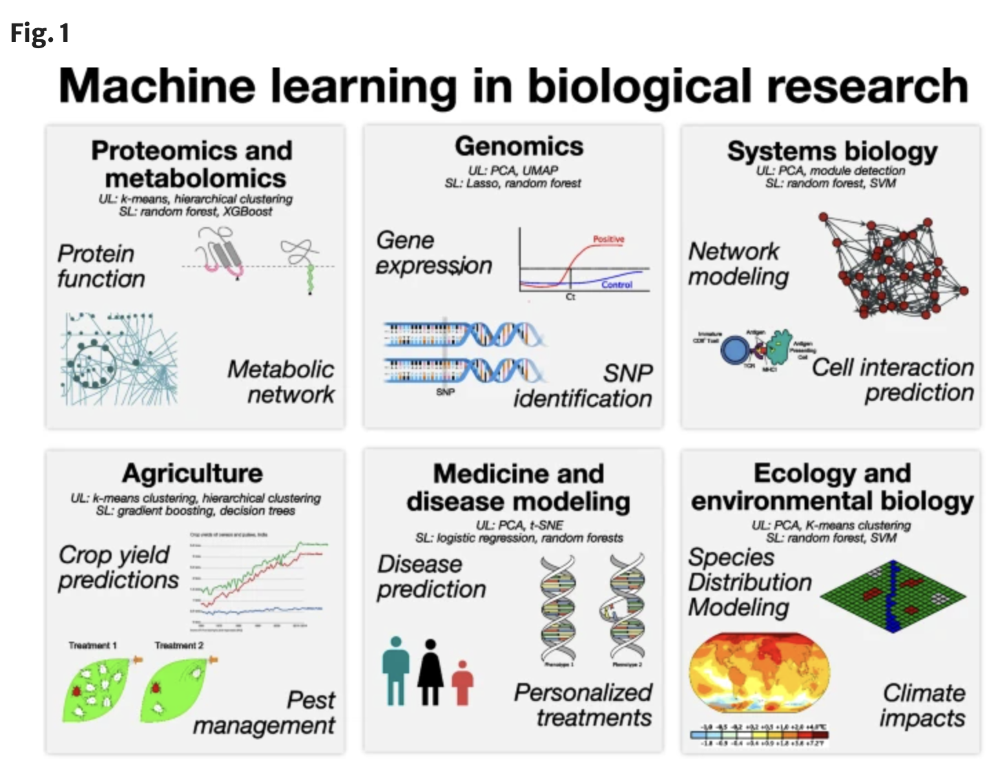 Oct 2025Machine learning is a robust framework to analyze questions using complex data in a variety of fields. We present definitions and recent applications of four key machine learning methods and discuss their advantages and challenges in biological research. Through a set of systematically selected case studies, we highlight how machine learning models have been used in a range of applications, including phylogenomics, disease prediction, and host taxonomy prediction. We identify additional potential areas of integration of machine learning into questions with biological relevance. This intersection can be further enhanced through collaboration and innovation on parallelization, interpretability, and preprocessing.
